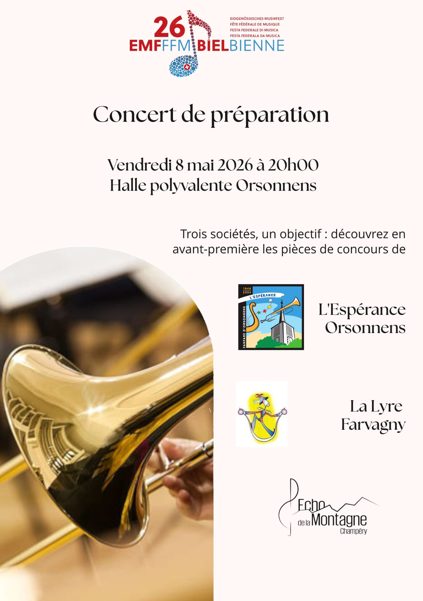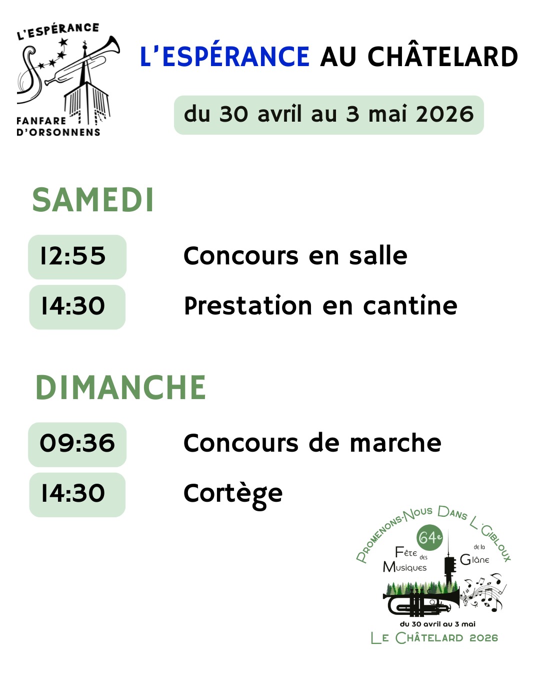 Pour la sixième fois de son histoire, l'Espérance a l'honneur d'organiser la Fête des musiques à Orsonnens ! Nous avons hâte de vous accueillir du 2 au 5 mai prochain.