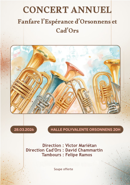 Concert. C'est avec grand plaisir que nos Cad'Ors vous convient à leur concert annuel qui se déroulera le samedi 12 mars prochain à 20h à Orsonnens ! 🎶 La première partie sera animée par l'Edel-Lyre, les cadets des fanfares du Crêt, de La Joux, et de Vuisternens-devant-Romont. |